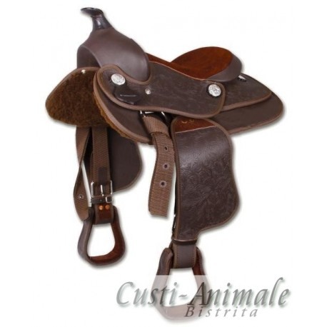 • sa Western pentru cai, dispune de un scaun din piele de caprioara, captusit, fapt ce ofera mai multa siguranta calaretului• marime 16”/40cm • culoare maro