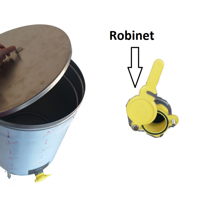 Din tabla de inox cu grosimea de 1mm, picioare atasate, 1 robinet de etansare din plastic special pentru miere, capac pentru praf cu maner. Dimenisuni: Diametru: 47 cm Inaltime rezervor 65.5 cm si picioare 28 cm. Material: Inox inoxidabil alimentar. Lateralele fundul si capacul butoiului confectionat din inox cu grosimea de 1mm, este foarte robust si durabil in timp indelungat.