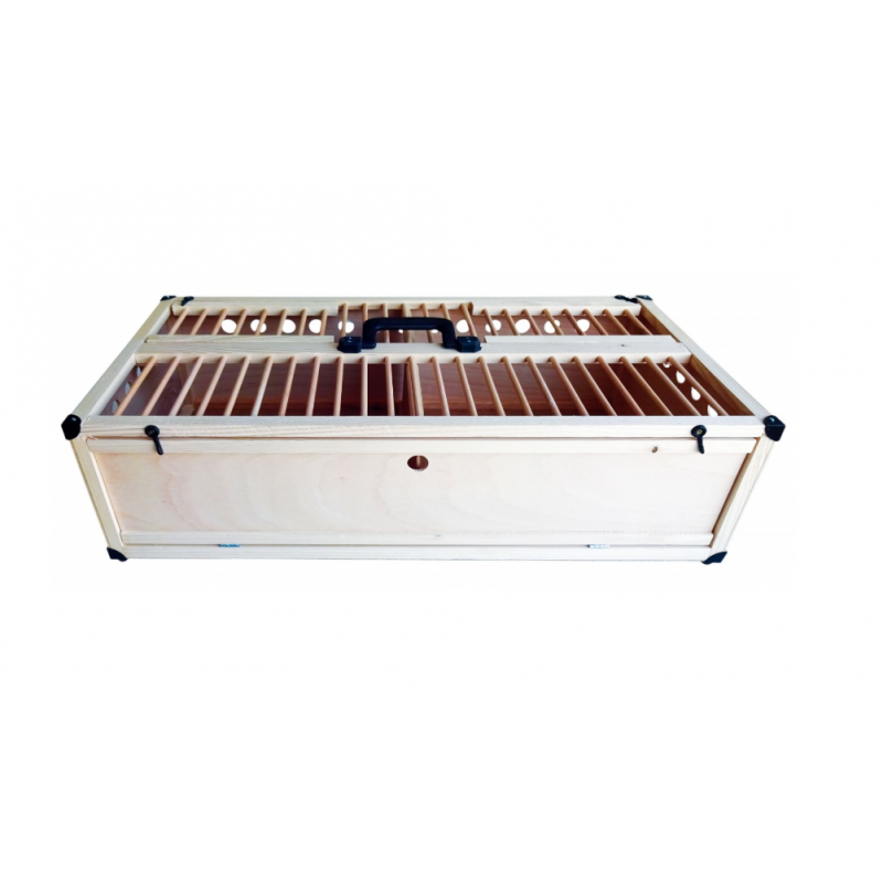 Cușcă pentru transportul porumbeilor. Contine un maner si picioare din placaj. O structură solidă din lemn de conifer realizată prin conectare. Ușa este confecționată din bețe de 8 mm, cu o distanță optimă pentru a asigura siguranța păsărilor.Lateralele cuștilor de transport porumbei sunt realizate din placaj de 4 mm grosime. Echipat cu orificii de ventilație cu diametrul de 25 mm. Partea inferioară a lăzii este realizată din plăci de fibre de 3 mm.