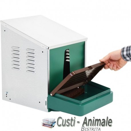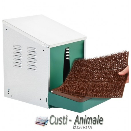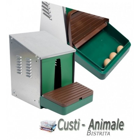 Foarte robust, confectionat din tabla galvanizata, prevazut cu tava colector de oua inchis din material plastic ABS rezistent cu usa . Partea din fata contine perdea pentru ca gainiile sa aiba mai multa liniste. Partea de jos ( podeaua) contine covoras moale detasabil.