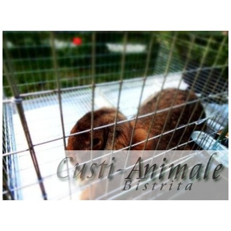 • cusca este prevazuta cu grilaj de podea dubla, cu densitatea plasei de 50x13mm cu grosimea firului de 2mm, aceasta podea permite evacuarea dejectiilor si murdariei cu usurinta din cusca in tavi.