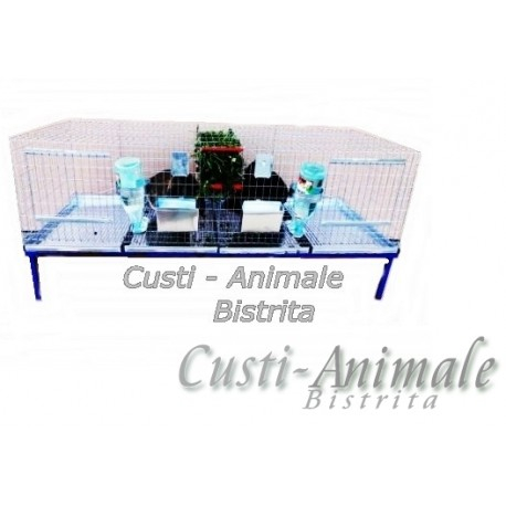 Cusca iepuri tineret cu doua compartimente Dimensiuni:   L= 200 cm l=60 Înălțimea=50 cm, este ideala pentru rasele mari de iepuri peste 5 kg ( Uriasul Belgian, Uriasul German, Berbecul engles, Marele Alb sau Termond, Uriasul francez, Angora )sau pentru cresterea a mai multi ieprui tineret in acelas compartiment datorita dimensiunilor si rezistentei . Cresterea iepurilor in astfel de custi este foarte igienica si recomandata de veterinari, comparativ cu custile din lemn care pot sa fi focare de infectie din cauza lemnului care apsoarbe umiditatea, iepurii vor sta in mediu uscat si au acces la hrana si apa in permanenta.