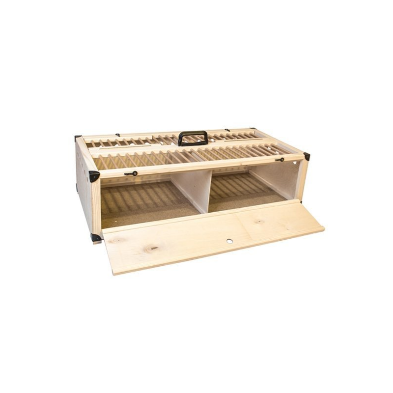 Cușcă pentru transportul porumbeilor. Contine un maner si picioare din placaj. O structură solidă din lemn de conifer realizată prin conectare. Ușa este confecționată din bețe de 8 mm, cu o distanță optimă pentru a asigura siguranța păsărilor.Lateralele cuștilor de transport porumbei sunt realizate din placaj de 4 mm grosime. Echipat cu orificii de ventilație cu diametrul de 25 mm. Partea inferioară a lăzii este realizată din plăci de fibre de 3 mm.Cusca este divizată in două compartimente.