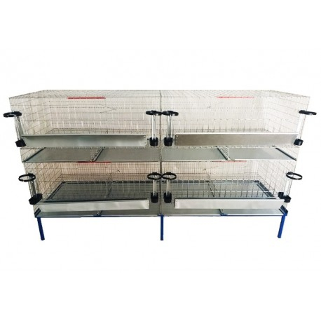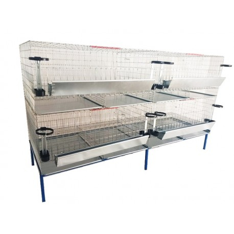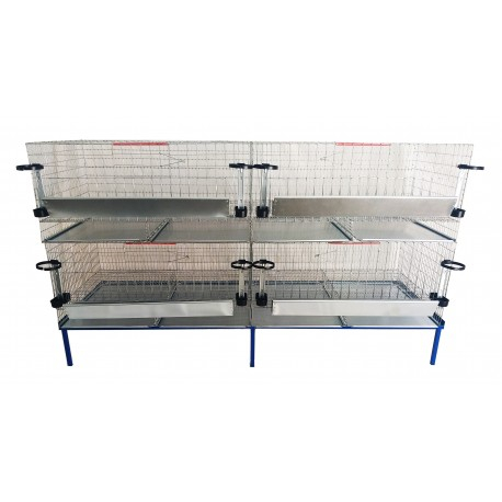 Dimensiunea unui nivel L 200 L 65 H 45 cm impartita in 4 compartimente. Include adapatori manuale, hranitoare furaj,tavi pentru curatarea dejectiilor. Fata custii prevazuta cu sistem reglabil a ochiurilor dupa varsta.Toate accesoriile detasabile cu acces din parte din fata. Inclus si suportul metalic de sustinere.
