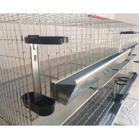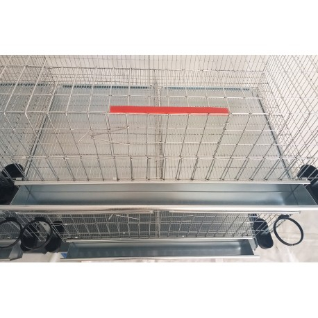 Din plasa de sarma zincata din producti proprie Custi-Animale Bistrita. Caracteristicile custii respecta normele bunastarii pasarilor prevazuta de Uniunea Europea. Podeau custii foare deasa cu ochiuri de 9/50 mm cu grosimea firului 2 mm. Lateralele custii cu ochiuri de 15/50 mm tot cu grosimea de 2 mm. Tavile pentru dejectii confectionate din tabla galvanizata.