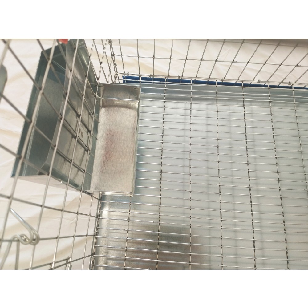doua tavi pentru curatarea dejectiilor confectionate din tabla zincata, cu margini inalte de 3.5cm si colturi inchise, ele fiind situate sub grilajul de podea al custii. Tavile se scot cu usurinta din partea din fata a custii pentru curatarea periodica.