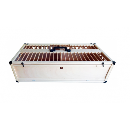 Cușcă pentru transportul porumbeilor. Contine un maner si picioare din placaj. O structură solidă din lemn de conifer realizată prin conectare. Ușa este confecționată din bețe de 8 mm, cu o distanță optimă pentru a asigura siguranța păsărilor.Lateralele cuștilor de transport porumbei sunt realizate din placaj de 4 mm grosime. Echipat cu orificii de ventilație cu diametrul de 25 mm. Partea inferioară a lăzii este realizată din plăci de fibre de 3 mm.