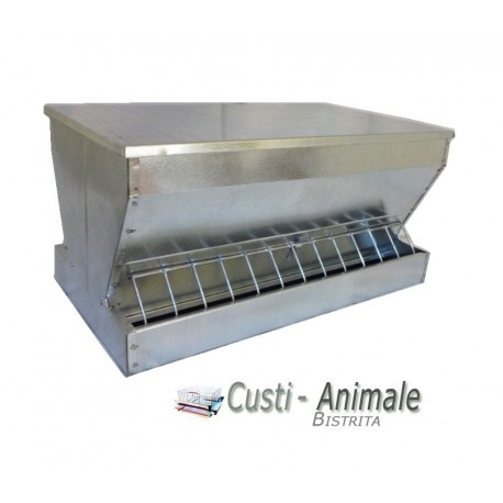 Hranitoare metalica galvanizata cu rezervor inchis, capacitatea de 20 litri, acces la hrana pe ambele parti si grilaje metalice pentru a diminua risipa de furaj. Pe masura ce se consuma furajul din zona de acces, se alimenteaza automat din rezervor. Ideal pentru pui, gaini, porumbei si toate pasarile de curte. Robust si calitativ in timp. Dimensiuni: L= 50 l= 30 H=25 cm, Capacitate de 20 litri.