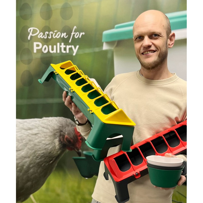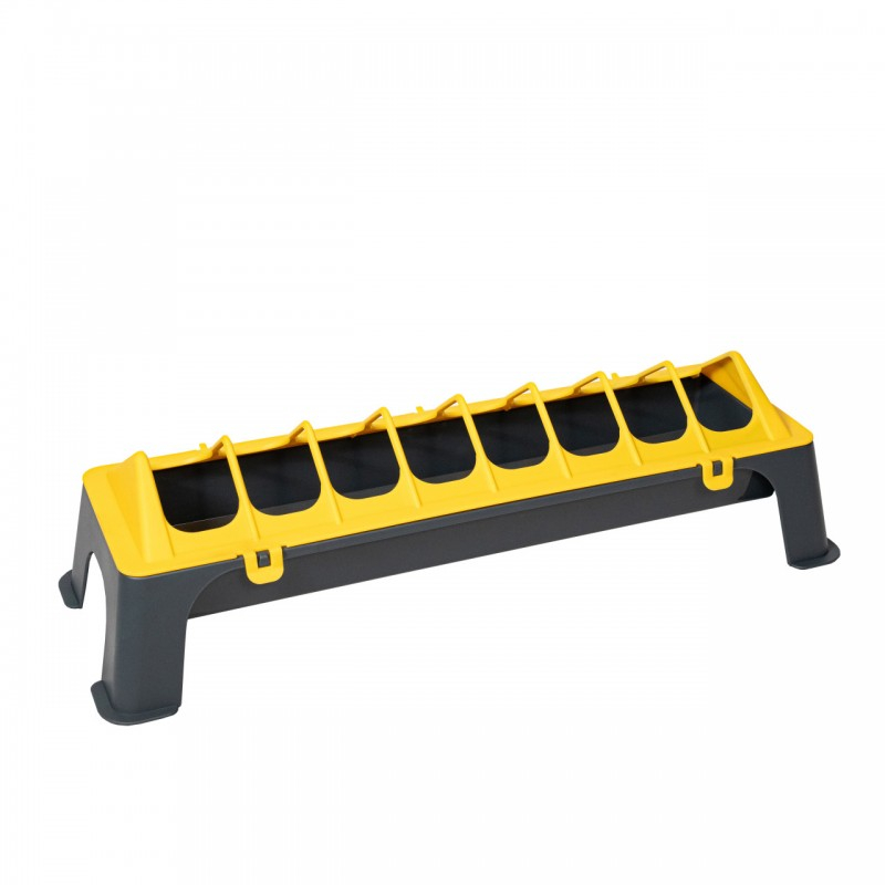 Hranitoare pentru pasari adulte de curte cu lungimea de 50 cm, realizat din plastic calitativ (PP), produs inovativ realizat de Olba din Olanda. Are o constructie foarte stabila si compacta, margini anti-varsare a furajului, grilaj anti-risipa cu posibilitate de rabatare pentru o reumplere mai usoara a furajului. Disponibil in mai multe combinatii de culori. Se poate utilizat atat pentru furaj macinat cat si granulat. Se uilizeaza pentru cresterea pasarilor la sol cu o durata de viata lunga de utilizare indiferent de conditiile atmosferice. Culoare: galben-antracit