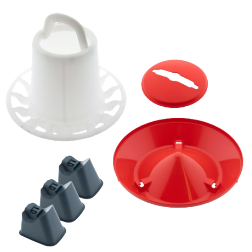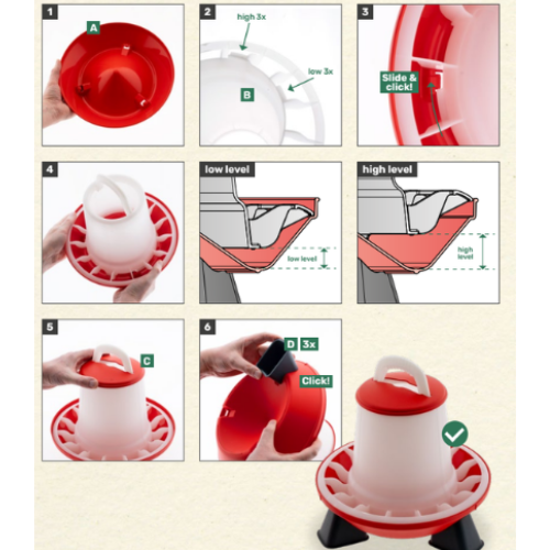 Noile hrănitoare pentru pui cu 2 niveluri prezintă un design îmbunătățit pentru a minimiza risipa de hrană, oferind în același timp un nivel reglabil de hrană, atât la nivel înalt, cât și la nivel scăzut. Reglarea înălțimii este foarte utilă pentru asigurarea cantitații necesare de hrană a păsărilor. Fie că este vorba de făină, firimituri sau pelete, acest lucru poate avea o influență majoră asupra risipei. Mai ales în cazul peletelor, vărsarea excesivă poate apărea rapid. Găinile tind să caute cele mai gustoase componente din hrană. Cu peletele acest lucru nu este posibil, așa că acestea continuă să sape, ceea ce poate cauza rapid o mulțime de risipă. Prin reglarea înălțimii, această risipă poate fi prevenită. Designul îmbunătățit prezintă un jgheab de hrănire mai adânc, cu o margine anti-vărsare îmbunătățită, asigurând o hrănire mai curată și mai eficientă. Un mâner superior robust, integrat, oferă stabilitate sporită și ușurință în utilizare. Pentru cele mai bune rezultate, agățați hrănitorul astfel încât partea de jos să se alinieze cu înălțimea spatelui animalelor. Pentru puii cu vârsta de până la 2 săptămâni, este recomandabil să așezați hrănitorul pe sol, mai degrabă decât să îl agățați. Acest nou hrănitor se poate utiliza cu sau fără picioare. Picioarele ajută la menținerea hranei mai curate, reducând contaminarea cu așternut sau alte resturi.