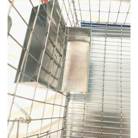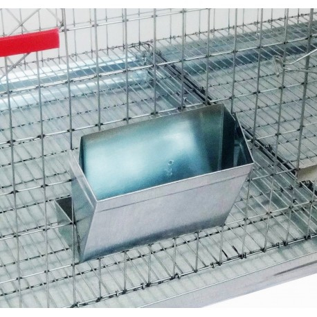 Acest tip de hranitoare este ideal de folosit la iepuri maturi, pentru alimentarea cu furaj combinat sau cereale. Alimentarea usoara si rapida din exteriorul custii, iar accesul la hrana a animalelor este din interior. O parte a rezervorului se poate monta in functie de cantitatea de furaji care se alimenteaza in zona de acces a animalului, astfel se poate diminua risipa de furaj, si controlul cantitatii consumate. Montajul se poate face pe orice tip de plasa cu ajutorul unor cleme din coltul hranitorului. Confectionat din tabla galvanizata cu grosimea de 0.4mm, rezistent la coroziune si durabil in timp.