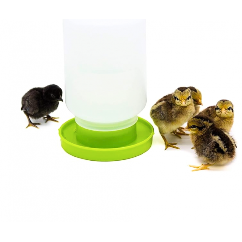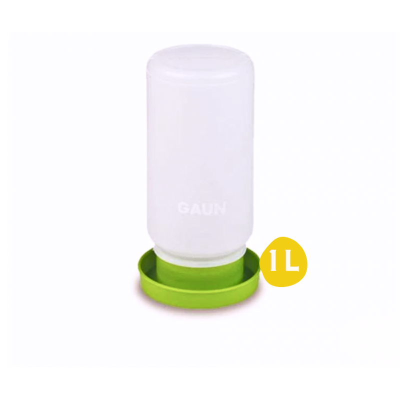 Adăpatoare pentru pui cu capacitatea rezervorului de 1 litru, realizat din material de plastic non-toxic, farfuria de adăpare se conecteaza la rezervorul alb cu închidere tip baionetă. Menține apa permanent curata si este ușor de curățat. Acest tip de adăpătoare se utilizează cu succes la puisoriI mici de păsări de curte si în special puișorilor de prepelițe. Puii nu se pot uda neavănd loc sa urce în zona cu apă. Astfel, rata mortalitatii scade in primele zile. Fabricat de Gaun.