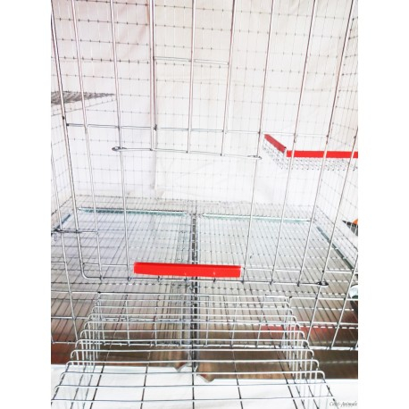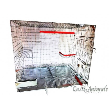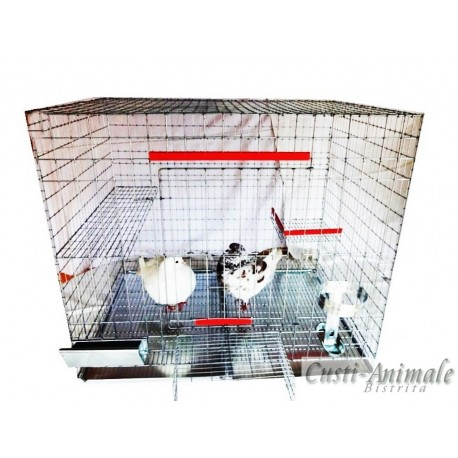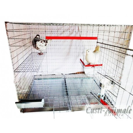Aceasta cusca este echipat complet cu toate accesoriile necesare, este idealla pentru o pereche de porumbei. Contine suport pentru cuibul de ouat, o etajera pentru odihna, hranitor pentr cerealea detasabil care este agatat in exterior iar porumbei isi scot capul printre caratii pentru a manca, contine adapator pentru suport pentru sticla, este prevazuta cu podea dubla, intre podele sunt doua tavi pentru dejectii care se scot din partea din fata a custii.